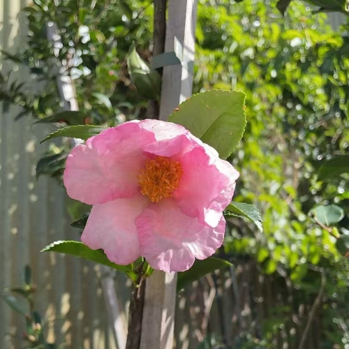 is a popular, fast-growing, upright evergreen shrub prized for hedging and screening. It produces large, soft-pink, single to semi-double flowers with yellow stamens in autumn. It is durable, thriving in full sun to part shade, and is drought-tolerant once established.
