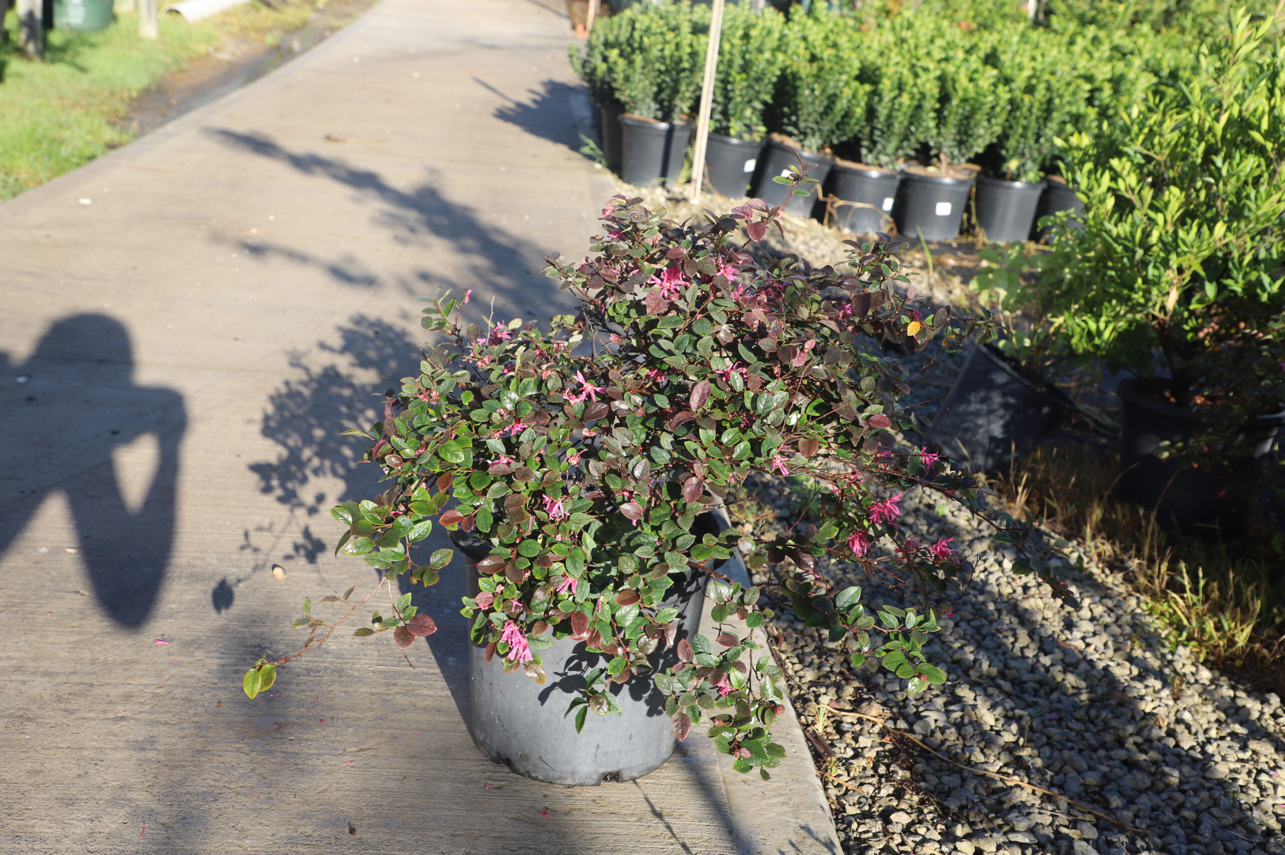 is a versatile, fast-growing, evergreen shrub prized for its burgundy foliage and bright pink, fringe-like flowers. Ideal as a hedge, screen, or specimen plant, it thrives in full sun to part shade and moist, well-drained soil, generally reaching 1.5–2m (5–6ft) in height, though some varieties can grow larger.